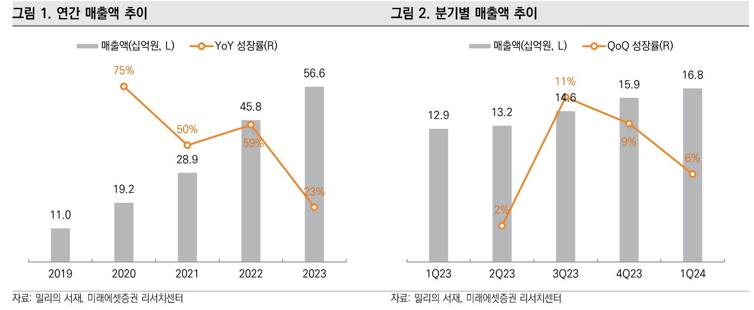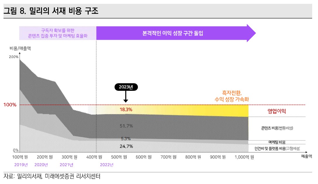 밀리의서재는 전자책 구독 서비스를 제공하며, 최근 독서 플랫폼 시장에서 주목받고 있음. 2024년 매출액은 850억원(YoY +15%), 영업이익은 90억원(YoY +10%)을 전망함. 2025년에는 매출액 1,000억원(YoY +18%), 영업이익 120억원(YoY +33%)을 예상함. 주요 성장 요인은 구독자 수 증가와 신규 콘텐츠 출시임.