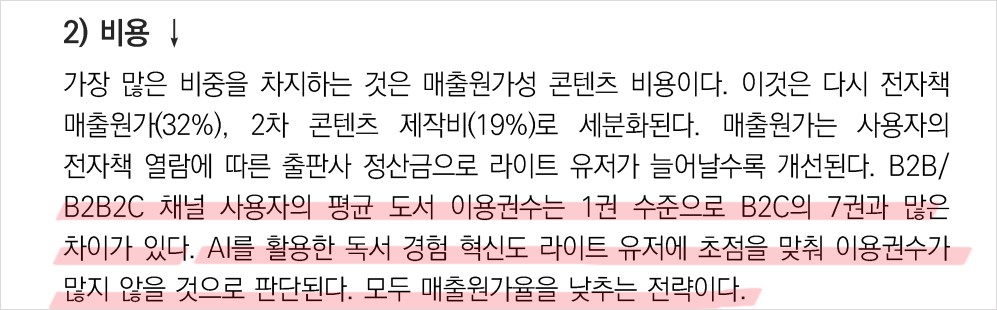 - 밀리의서재의 독점 콘텐츠는 경쟁사 대비 큰 강점으로 작용하고 있음.