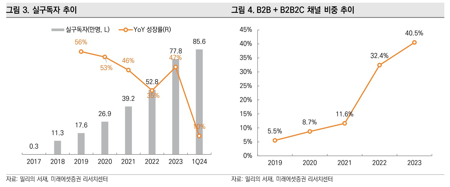 밀리의서재는 전자책 구독 서비스 분야에서 강력한 경쟁력을 보유한 기업임. 다양한 독점 콘텐츠와 이용자 맞춤형 서비스로 높은 구독자 만족도를 유지하고 있음. 2023년 매출액은 740억원, 영업이익은 82억원을 기록했으며, 전사 영업이익률은 11.1%로 안정적인 수익성을 보임.