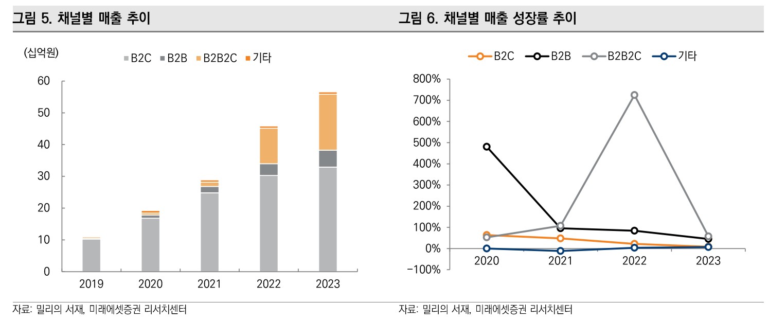 밀리의서재는 전자책 구독 서비스 분야에서 강력한 경쟁력을 보유한 기업임. 다양한 독점 콘텐츠와 이용자 맞춤형 서비스로 높은 구독자 만족도를 유지하고 있음. 2023년 매출액은 740억원, 영업이익은 82억원을 기록했으며, 전사 영업이익률은 11.1%로 안정적인 수익성을 보임.