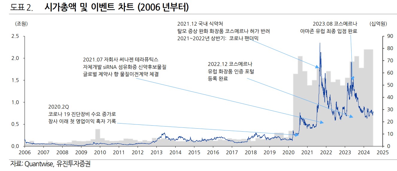 최근 바이오니아는 다양한 사업에서의 성과를 보였습니다. 2분기 실적 발표에서는 매출액 69.4억 원, 영업이익 5.1억 원을 기록하며 긍정적인 성과를 보였습니다. 프로바이오틱스 제품 비에날씬의 판매가 꾸준히 증가하고 있으며, 코스메르나의 출시 지연에도 불구하고 향후 성장이 기대됩니다. 특히 코스메르나는 국내 출시가 지연되었으나, 중동 및 동유럽 시장에서 판매를 확대 중입니다. 바이오니아의 전략적 사업 재편과 수익성 개선 노력은 앞으로의 주가 상승을 견인할 중요한 요소가 될 것입니다.