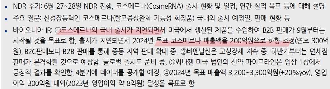 최근 바이오니아는 다양한 사업에서의 성과를 보였습니다. 2분기 실적 발표에서는 매출액 69.4억 원, 영업이익 5.1억 원을 기록하며 긍정적인 성과를 보였습니다. 프로바이오틱스 제품 비에날씬의 판매가 꾸준히 증가하고 있으며, 코스메르나의 출시 지연에도 불구하고 향후 성장이 기대됩니다. 특히 코스메르나는 국내 출시가 지연되었으나, 중동 및 동유럽 시장에서 판매를 확대 중입니다. 바이오니아의 전략적 사업 재편과 수익성 개선 노력은 앞으로의 주가 상승을 견인할 중요한 요소가 될 것입니다.
