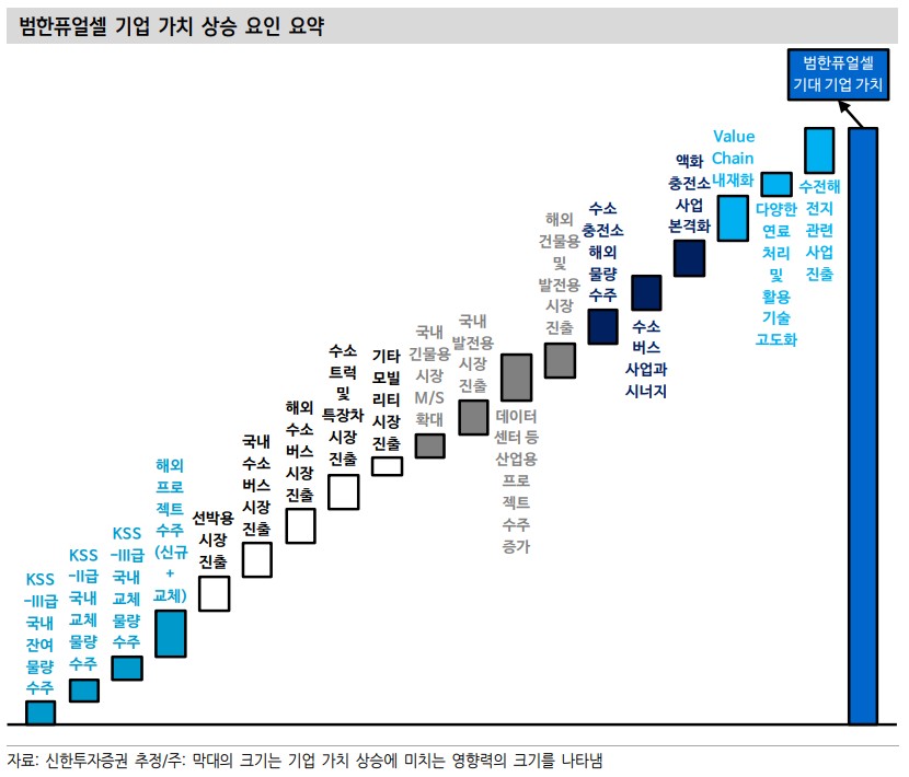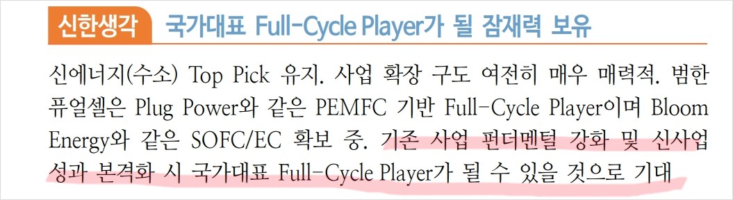 범한퓨얼셀은 기술력과 시장 확장 가능성으로 주목받고 있음. 기존 잠수함용 PEMFC 사업의 안정적인 매출과 더불어 건물용 및 선박용 연료전지 시장에서도 경쟁력을 확보하고 있음. 또한, 수소 버스 및 수소 충전소 사업의 성과가 가시화되면서 향후 매출 성장률이 높아질 것으로 전망됨.