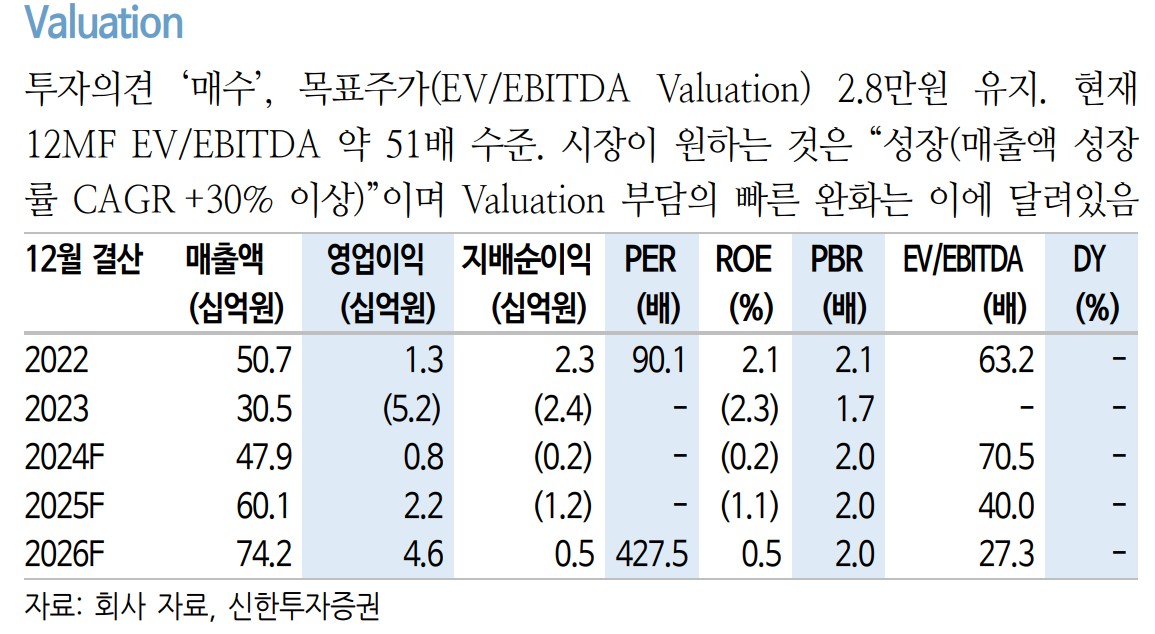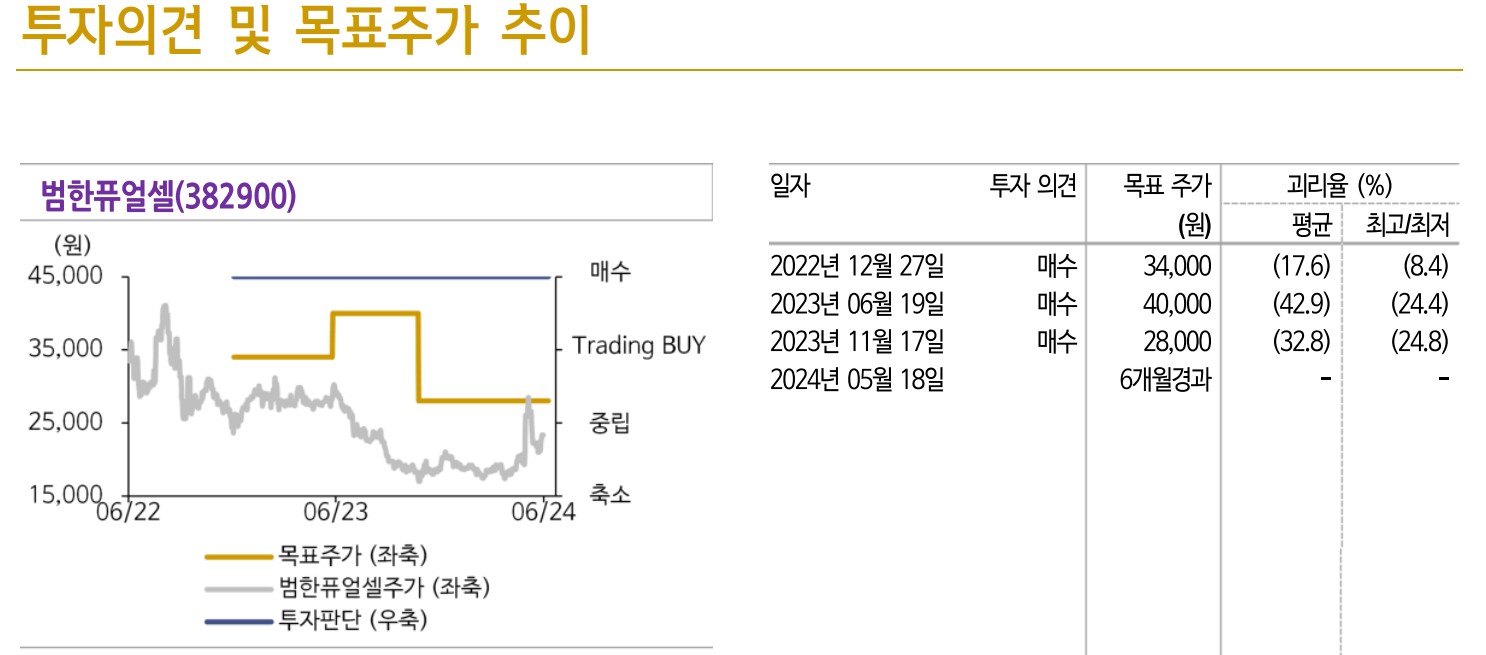 범한퓨얼셀의 목표주가는 28,000원으로 설정됨. 이는 신사업 확장과 기존 사업의 성과가 반영된 결과임. 투자자들은 목표주가 달성을 위해 신사업 진행 상황과 기술 개발의 성과를 주의 깊게 살펴볼 필요가 있음.