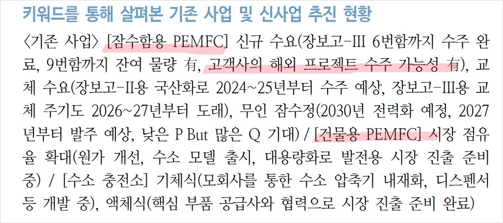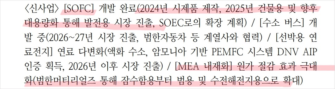 범한퓨얼셀은 최근 몇 년간 다양한 수주와 계약을 통해 성장 중임. 특히, 잠수함용 PEMFC와 건물용 PEMFC 시장에서의 점유율을 확장하고 있음. 장보고-III 6번함까지 수주 완료, 장보고-II용 교체 수요 예상 등은 긍정적인 요소임. 또한, 수소 버스와 선박용 연료전지 개발 등 신사업 분야에서도 활발한 움직임을 보이고 있음.