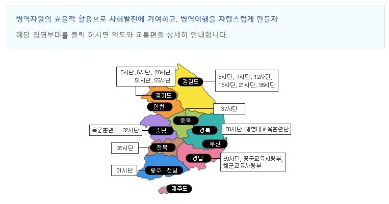 병무청 입영부대가는길 서비스는 입영하는 병사들과 그 가족들이 입영 부대까지의 경로를 쉽게 찾을 수 있도록 돕습니다. 교통 안내는 입영 부대까지의 대중교통 및 자가용 이용 경로를 상세히 안내합니다.