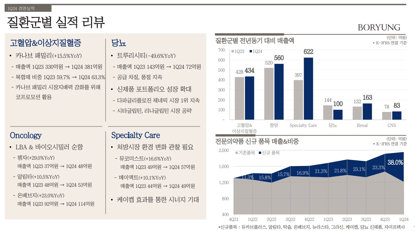 보령은 최근 카나브 단일제 제네릭 출시로 인한 약가 인하에도 불구하고 HK이노엔과의 공동판매 계약을 통해 카나브 패밀리의 성장을 이어가고 있음. 2024년 1분기 매출액은 233.6억 원으로 전년 동기 대비 16% 증가하고, 영업이익은 16.4억 원으로 2% 증가함. 또한, LBA(Legacy Brand Acquisition) 모델을 통해 젬자와 자이프렉사 등의 신약도 안정적인 성장세를 보이고 있음.