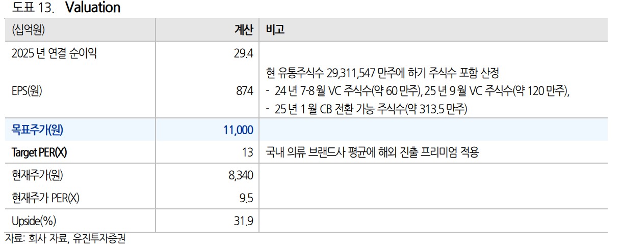 목표주가는 11,000원으로 설정함. 이는 현재 주가 대비 약 36%의 상승 여력을 보임. 다양한 사업 부문에서의 성장과 안정적인 수익 구조를 바탕으로 목표주가를 제시함.