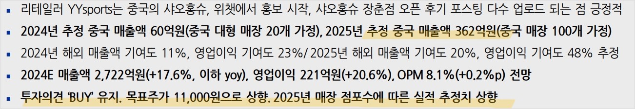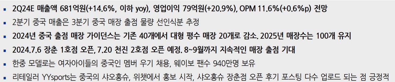 브랜드엑스코퍼레이션은 최근 중국에서의 매장 확장과 함께 해외 매출 기여도가 높아지고 있음. 중국 장춘 및 천진에 매장 오픈 예정. 또한, 리테일러 YYsports를 통해 중국 시장에서의 홍보를 강화하고 있음. 우기와 같은 유명인을 모델로 기용하여 브랜드 인지도 상승을 기대할 수 있음. 2024년 말까지 20개의 대형 매장을 출점할 계획이며, 이를 통해 중국 매출이 크게 증가할 것으로 예상됨.
