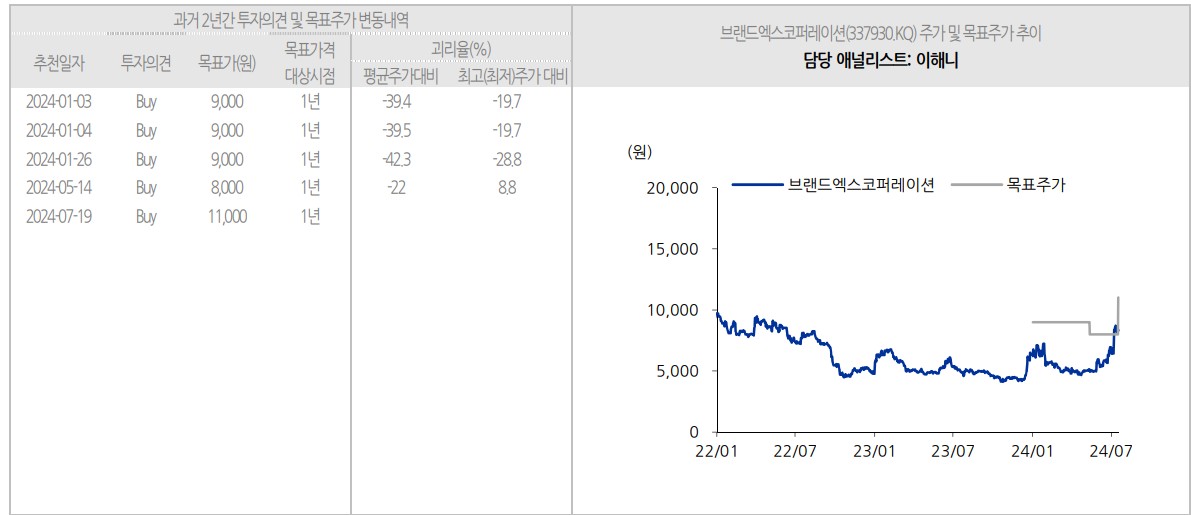 브랜드엑스코퍼레이션의 주가는 앞으로 꾸준한 상승세를 보일 것으로 예상됨. 중국 시장에서의 성공적인 확장과 해외 매출 증가는 주가에 긍정적인 영향을 미칠 것으로 보임. 2024년 하반기에는 더 큰 실적 개선이 기대됨.