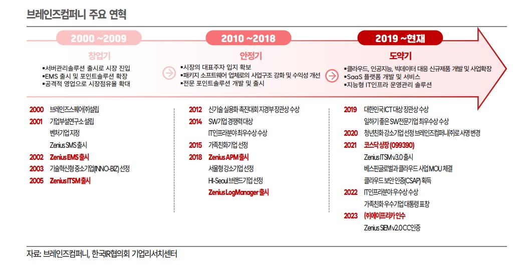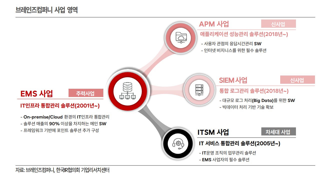 브레인즈컴퍼니는 2000년 설립된 IT 인프라 통합관리 전문 소프트웨어 기업임. 최근에는 AI 개발에도 진출하여 주목받고 있음. IT 인프라 통합관리 솔루션 분야에서 두각을 나타내고 있으며, 2021년 코스닥 시장에 상장됨. 이번에 AI관련주로 살짝 엮여있던데, 한번 살펴보시길.