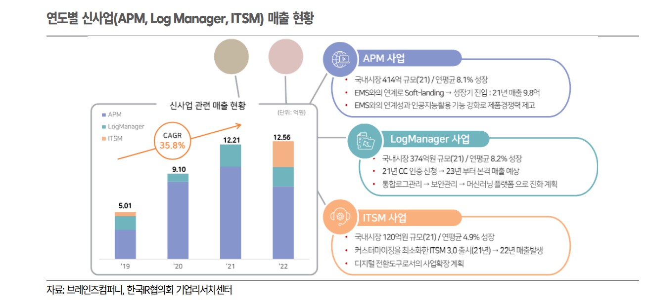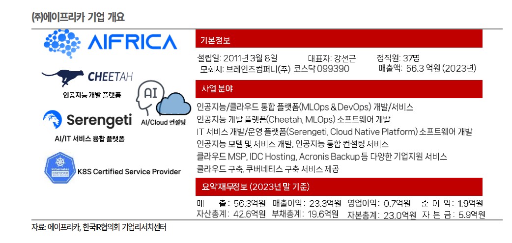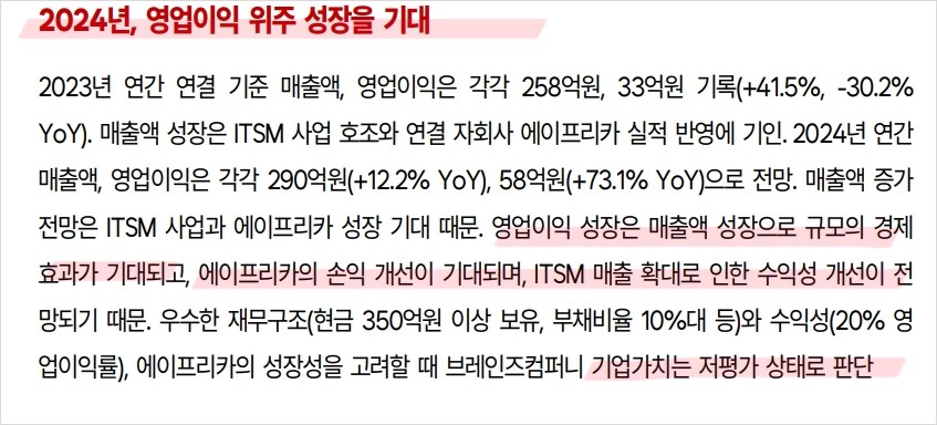 브레인즈컴퍼니는 2023년 AI 및 클라우드 산업 관련 신성장동력 확보를 위해 '에이프리카'를 인수함. 이에 따라 IT 인프라 통합관리뿐만 아니라 AI 개발 플랫폼과 클라우드 관리 솔루션까지 사업 영역을 확장함. 2024년 매출액은 290억원(+12.2% YoY), 영업이익은 58억원(+73.1% YoY)으로 전망됨. ITSM 사업과 에이프리카의 성장 덕분임. 특히 ITSM 매출은 2023년 8.7억원에서 2024년 15억원으로 확대될 것으로 예상됨. 우수한 재무구조와 높은 수익성으로 기업가치가 저평가 상태임.