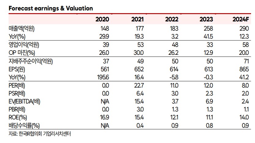 - 2024년 매출액 290억원, 영업이익 58억원 전망