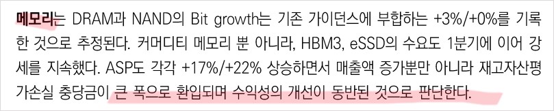 삼성전자는 최근 반도체 수요 회복과 기술 개발 덕분에 긍정적 실적 전망을 보임. 특히, 메모리 반도체 부문에서의 기술 혁신이 주목받고 있으며, 이를 통한 비용 절감과 성능 향상이 기대됨. 또한, 모바일 부문에서는 신제품 출시와 적극적인 마케팅 전략으로 시장 점유율 확대를 목표로 하고 있음. 가전 부문에서는 프리미엄 제품 판매 증가로 인해 안정적인 매출 성장이 예상됨.