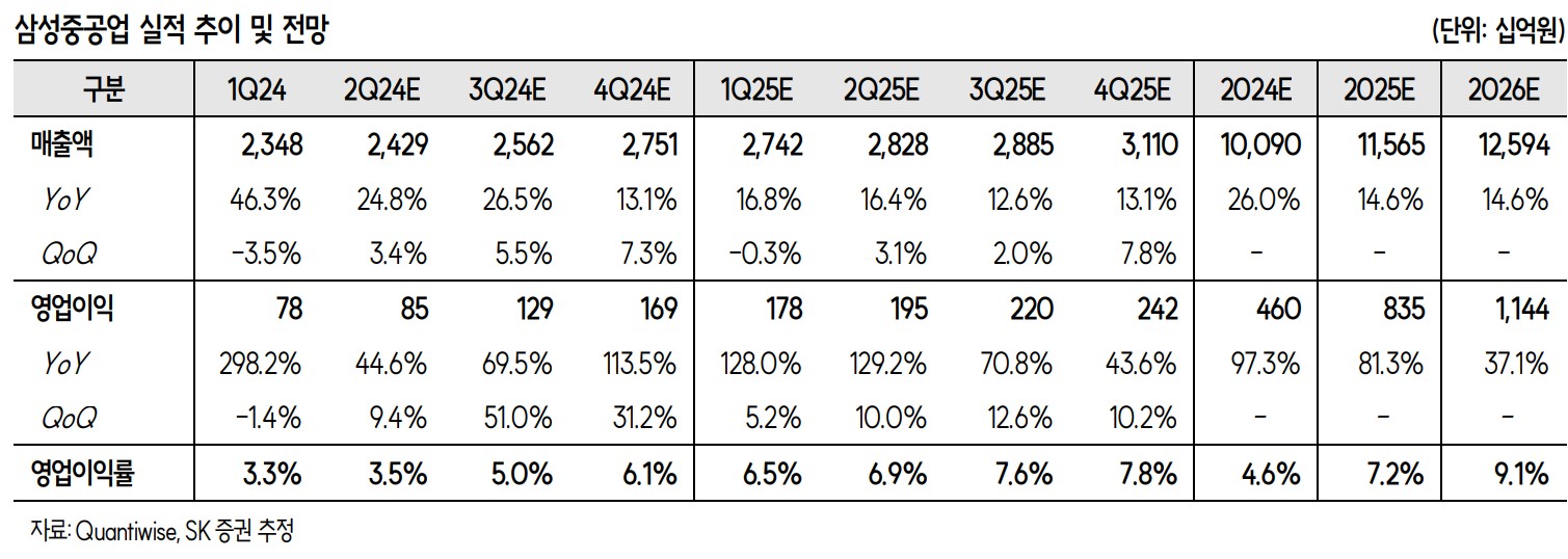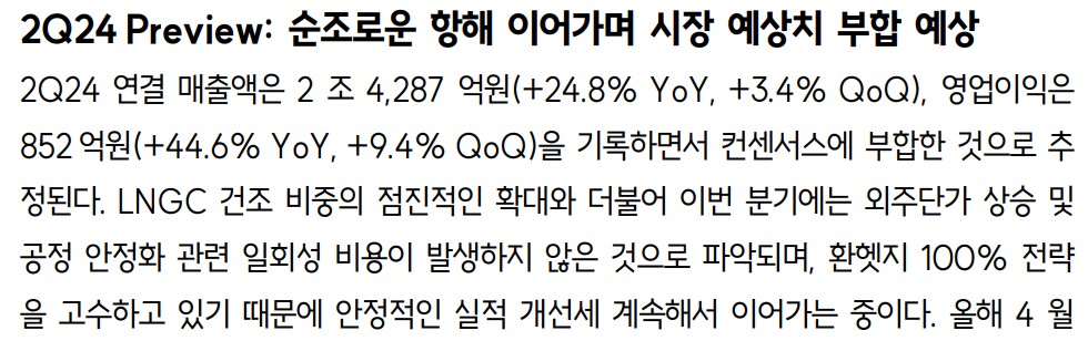 삼성중공업은 2024년 2분기에 매출액 2조 4,287억 원, 영업이익 852억 원을 기록할 것으로 예상됨. 이는 전년 동기 대비 각각 24.8%, 44.6% 증가한 수치로, LNGC 건조 비중 확대와 외주단가 상승 및 공정 안정화 관련 일회성 비용이 발생하지 않은 것이 주요 원인임.