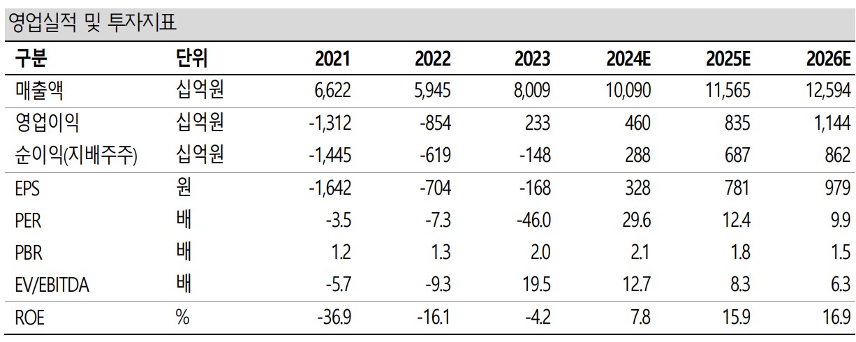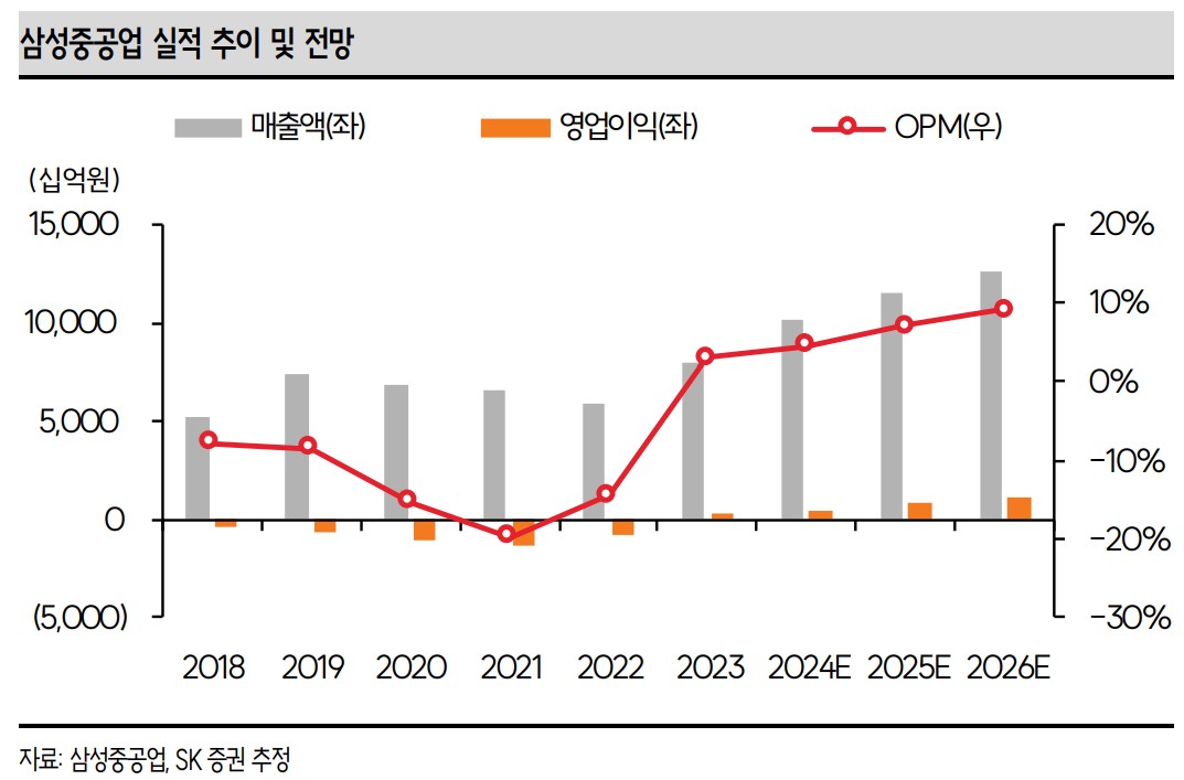 삼성중공업은 안정적인 수주와 공정 안정화를 통해 실적 개선세를 이어가고 있음. 특히 LNGC 건조 비중 확대와 고선가 건조 비중 증가가 긍정적인 영향을 미칠 것으로 보임. 2024년에는 매출액 10조 900억 원, 영업이익 460억 원을 기록할 것으로 예상됨.