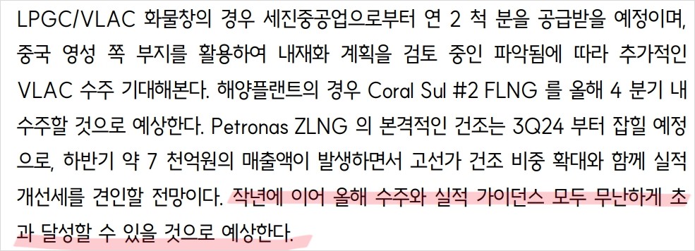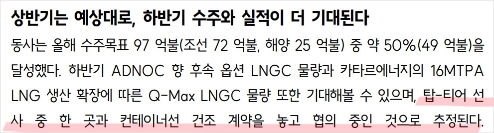 삼성중공업은 올해 수주 목표의 절반인 49억 불을 상반기에 달성하며 안정적인 실적을 이어가고 있음. 하반기에는 ADNOC 향 후속 옵션 LNGC 물량과 카타르에너지의 16MTPA LNG 생산 확장에 따른 Q-Max LNGC 물량, 그리고 컨테이너선 건조 계약 등이 추가로 기대됨. 해양플랜트 부문에서는 Coral Sul #2 FLNG를 올해 4분기에 수주할 것으로 예상됨.