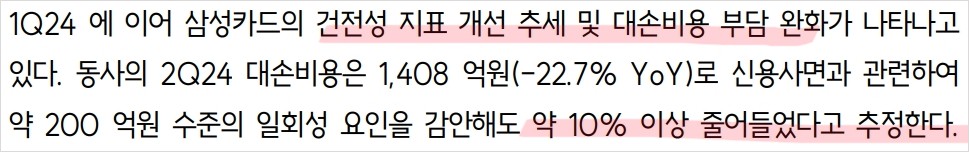 최근 삼성카드는 대손비용의 감소와 함께 건전성 지표가 뚜렷하게 개선되었음. 2분기 대손비용은 1,408억원으로 전년 동기 대비 22.7% 감소하였으며, 신용사면과 관련한 일회성 요인을 제외하더라도 약 10% 이상 줄어들었음. 이는 개인신판 중심의 무이자할부 재개와 같은 선별적 마케팅의 확대로 이어지고 있음. 또한, 하반기에는 개인채무자보호법에 따른 연체 회수 환경의 악화가 예상되지만, 대손비용 부담은 전년 대비 크게 줄어들 전망. 삼성카드는 온라인 쇼핑, 여행업종 중심의 이용금액 증가와 더불어 2분기 당기순이익이 1,849억원으로 전년 동기 대비 27.4% 증가함.