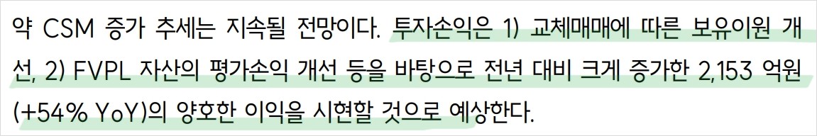 최근 삼성화재는 장기보험의 예실차 손익 안정화와 투자손익의 대폭 개선으로 주목받고 있음. 2분기 투자손익은 전년 대비 54% 증가한 2,153억원을 기록할 전망. 일반보험과 자동차보험의 이익은 줄어들었지만, 장기보험의 견조한 이익 개선과 투자손익의 상승이 이를 상쇄함. 특히 FVPL 자산의 평가손익 개선이 주요 요인임. 이러한 안정적인 실적과 자본력은 향후 주가 상승의 주요 동력이 될 것으로 예상됨.
