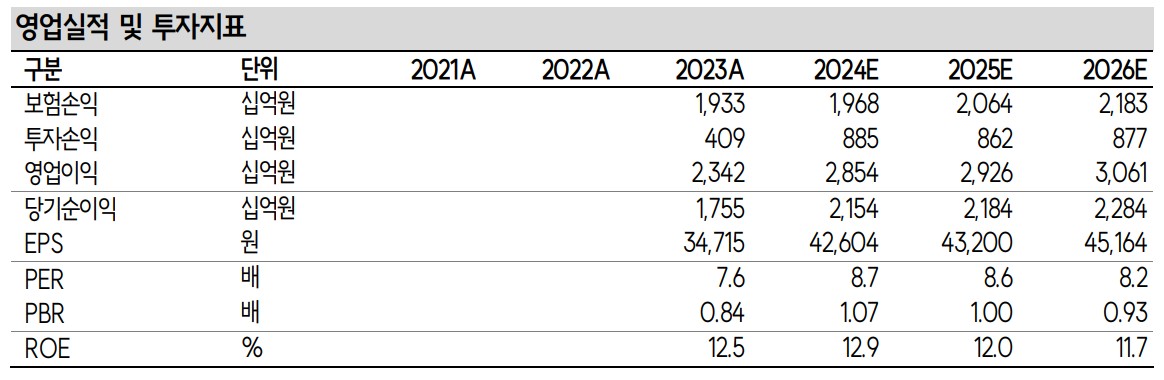 삼성화재는 장기보험의 안정적인 이익과 투자손익의 대폭 개선으로 안정적인 실적을 이어가고 있음. 2024년 2분기 실적은 전반적으로 견조한 성장을 보여줄 것으로 예상됨. 하지만 일반보험과 자동차보험의 이익 감소는 주의할 필요가 있음. 투자손익의 개선이 주된 긍정적 요인으로 작용할 것으로 보이며, 장기적으로는 안정적인 자본력과 실적이 주가 상승의 주요 동력이 될 것임.