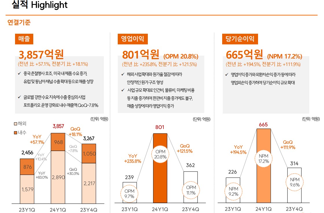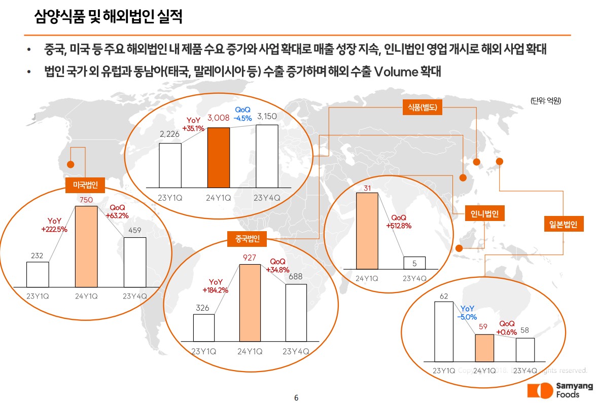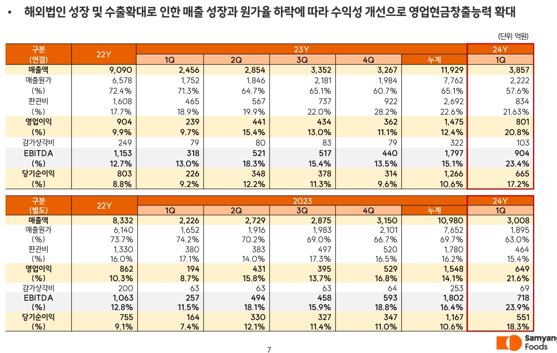 삼양식품은 2024년 1분기 매출액 3857억 원, 영업이익 801억 원을 기록하며 전년 대비 큰 폭의 실적 성장을 보였습니다. 이는 미국과 유럽을 중심으로 한 해외 시장에서의 수요 증가 덕분입니다. 또한, 밀양 제2공장의 증설로 인해 생산 능력이 확대되었으며, 이는 향후 매출 성장에 긍정적인 영향을 미칠 것입니다. 삼양식품은 지속적인 제품 개발과 글로벌 마케팅을 통해 브랜드 가치를 높이고 있습니다.