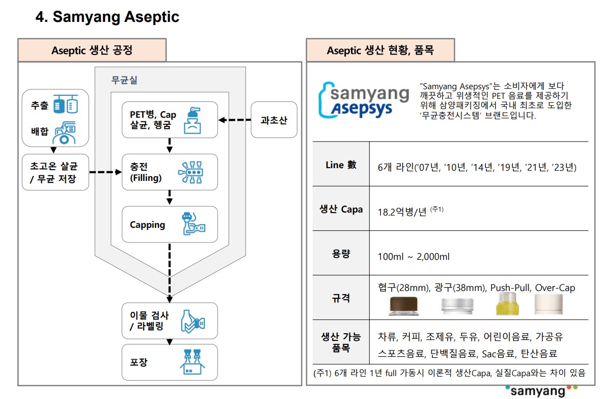 삼양패키징은 음료수용 PET병 제조 및 아셉틱 패키징 OEM/ODM 사업을 영위하는 기업으로, 꾸준한 성장을 보이고 있음. 2024년 매출액은 4,581억 원, 영업이익은 469억 원으로 예상됨. 아셉틱 패키징 시장의 성장과 R-CHIP 매출 발생으로 인한 수익성 개선이 기대됨.