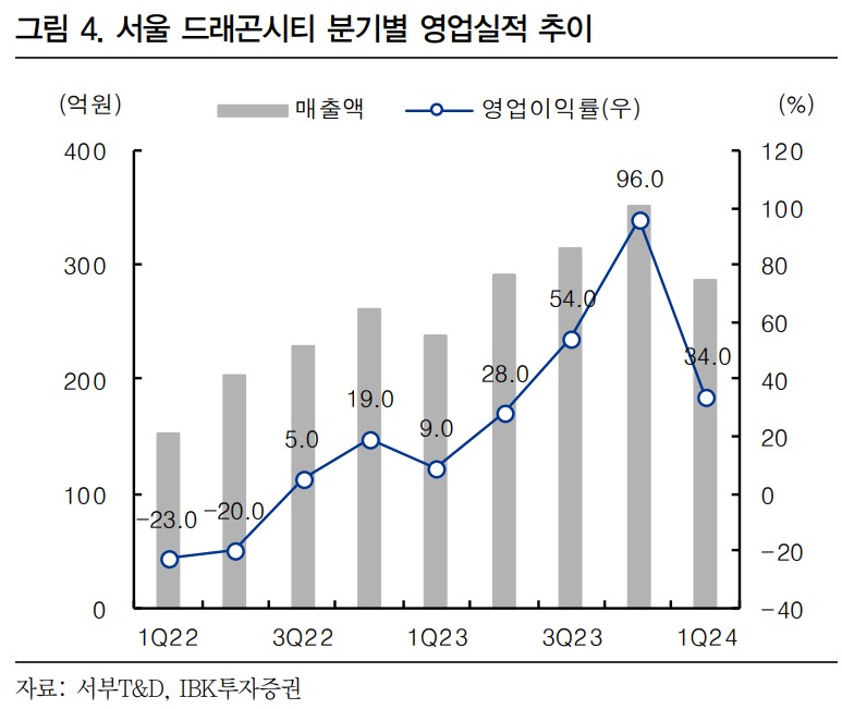 서부T&D는 최근 2024년 1분기 매출액 414억 원, 영업이익 108억 원으로 전년 동기 대비 각각 16.3%, 47.9% 증가하는 실적을 기록했음. 이는 계절적 비수기인 1분기에 이룬 성과로, 외국인 인바운드 수요 증가가 큰 영향을 미쳤음. 2024년 2분기에도 성장세가 지속될 것으로 보이며, 호텔사업부 매출액은 15% 이상 증가할 것으로 예상됨.
