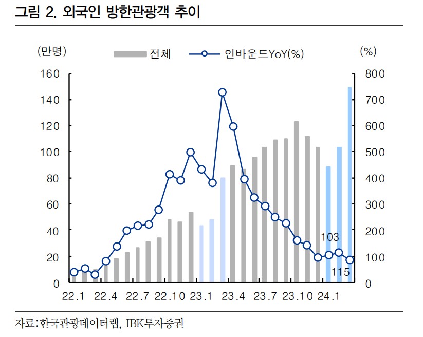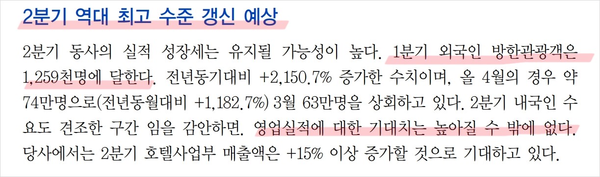 서부T&D는 최근 2024년 1분기 매출액 414억 원, 영업이익 108억 원으로 전년 동기 대비 각각 16.3%, 47.9% 증가하는 실적을 기록했음. 이는 계절적 비수기인 1분기에 이룬 성과로, 외국인 인바운드 수요 증가가 큰 영향을 미쳤음. 2024년 2분기에도 성장세가 지속될 것으로 보이며, 호텔사업부 매출액은 15% 이상 증가할 것으로 예상됨.