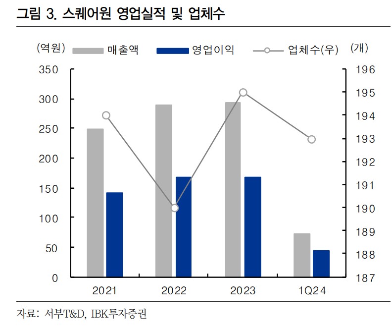 서부T&D는 공간 정보 통합 솔루션을 제공하는 기업으로, 공공기관을 주요 고객사로 두고 있음. 2023년 매출액은 488억 원, 영업이익은 51억 원을 기록했으며, 전사 영업이익률은 10.4%로 안정적인 수익성을 보임. 특히, 공공기관과의 장기 계약을 통해 꾸준한 유지보수용역 매출을 창출하고 있음.