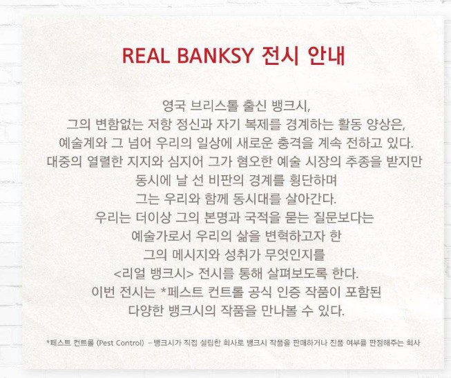 리얼뱅크시는 그라운드서울 기획전시관에서 열리고 10월 20일까지 볼 수 있는 전시회에요. 영국 브리스톨 출신 뱅크시가 저항 정신과 자기 복제를 경계하는 예술적 작품들을 볼 수 있다고 하네요!