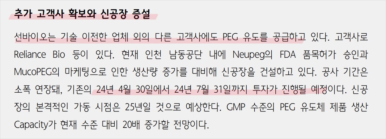 선바이오, PEGylation 기술 기반으로 바이오시밀러, 의료기기, 인공 혈액 등 다양한 분야에서 성장 중. 2024년 매출액 150억원, 영업이익 70억원 예상. 수익성 개선 가능성 큼. 신규 수요처 확보로 인한 성장 기대.