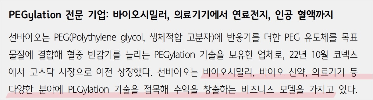 선바이오는 PEGylation 기술을 보유한 바이오 기업으로, 바이오시밀러, 의료기기, 인공 혈액 등 다양한 분야에서 활동 중임. 22년 코넥스에서 코스닥 시장으로 이전 상장하여 기술력을 인정받음. 본 글은 선바이오의 최근 실적, 주요 이슈 및 주가 전망에 대해 전문 애널리스트의 관점에서 분석한 내용임. 모든 투자책임은 본인에게 있음.