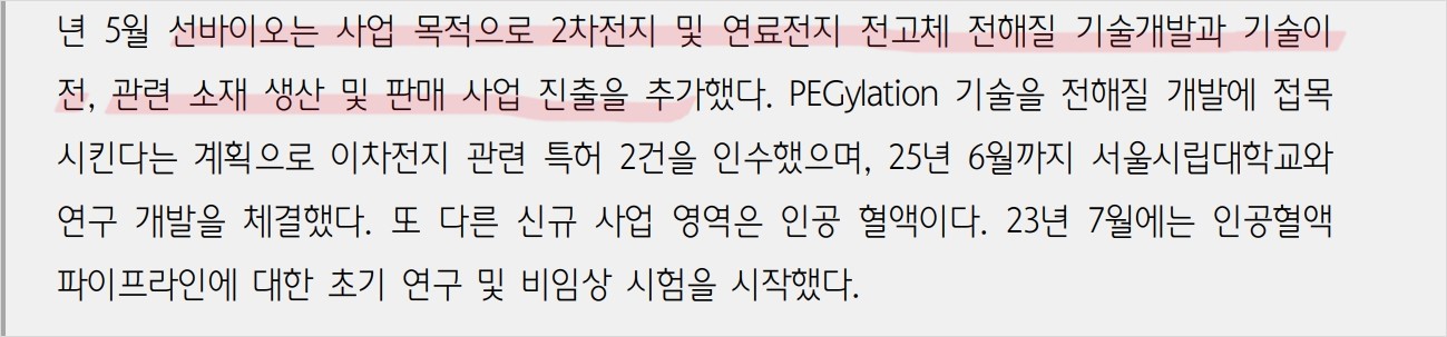 선바이오는 PEGylation 기술을 보유한 업체로, 바이오시밀러, 의료기기, 인공 혈액 등 다양한 분야에 기술을 접목해 수익을 창출하는 비즈니스 모델을 가지고 있음. 대표적인 제품으로는 호중구감소증 치료제 Neulasta 바이오시밀러와 구강건조증 치료제 MucoPEG이 있음. 2022년 매출액 123억원, 영업이익 52억원을 기록했으며, 2024년 1분기 매출액 19억원, 영업이익 -4억원을 기록함. 23년 5월부터 2차전지 및 연료전지 전고체 전해질 기술개발과 관련 소재 생산 및 판매 사업에 진출했음.