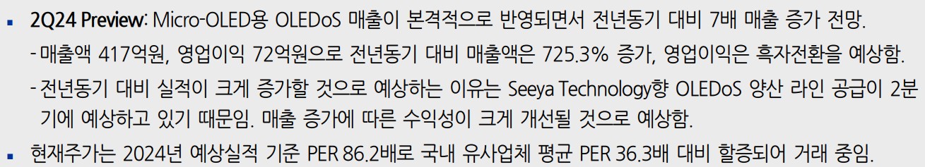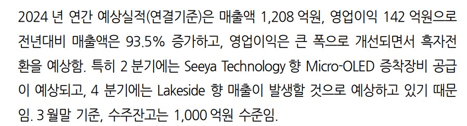 선익시스템은 OLED 증착 장비 시장에서 강점을 보유하고 있으며, 주요 고객사인 중국 B사와의 계약을 통해 중장기 성장 동력을 확보하고 있음. 또한, Micro-OLED 시장의 성장과 함께 관련 매출 증가가 기대됨. 실적 개선과 함께 주가 상승 가능성이 높아지고 있음.