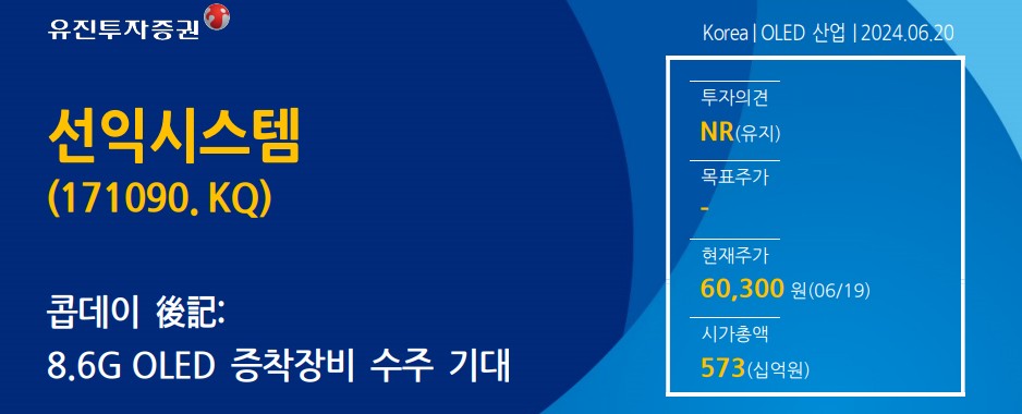 최근 선익시스템은 중국 B사와의 8.6G OLED 공급 계약이 임박한 상황임. 이 계약은 중장기적으로 기업의 실적 성장에 큰 기여를 할 것으로 예상됨. 또한, 글로벌 디스플레이 패널 제조업체와의 추가 계약 가능성도 높아져, 실적 성장에 긍정적인 영향을 미칠 것으로 보임.