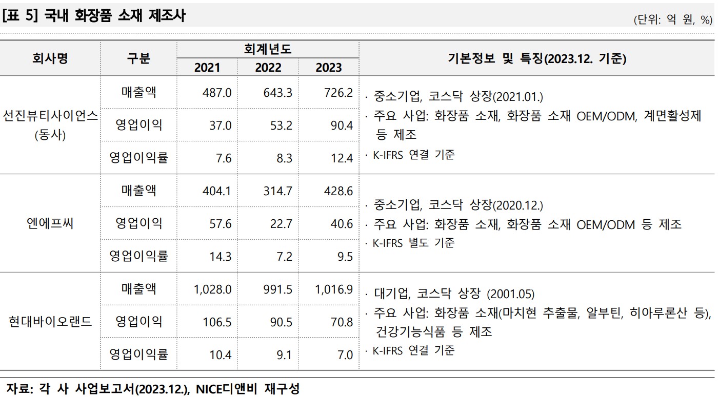 선진뷰티사이언스는 2023년 매출액 726.2억 원, 영업이익 90.4억 원을 기록하며 전년 대비 12.9%의 매출 성장률을 보였습니다. 동사는 다양한 화장품 소재를 개발 및 제조하여 글로벌 시장에 공급하고 있으며, 주요 제품으로는 마이크로 비드, 자외선 차단 소재, 스킨케어 소재 등이 있습니다. 최근 글로벌 화장품 산업의 성장세와 함께 동사의 매출도 지속적으로 증가하고 있으며, 특히 미국 식품의약국(FDA) 규제 대응을 위한 선제적 준비로 경쟁력을 확보하고 있습니다.