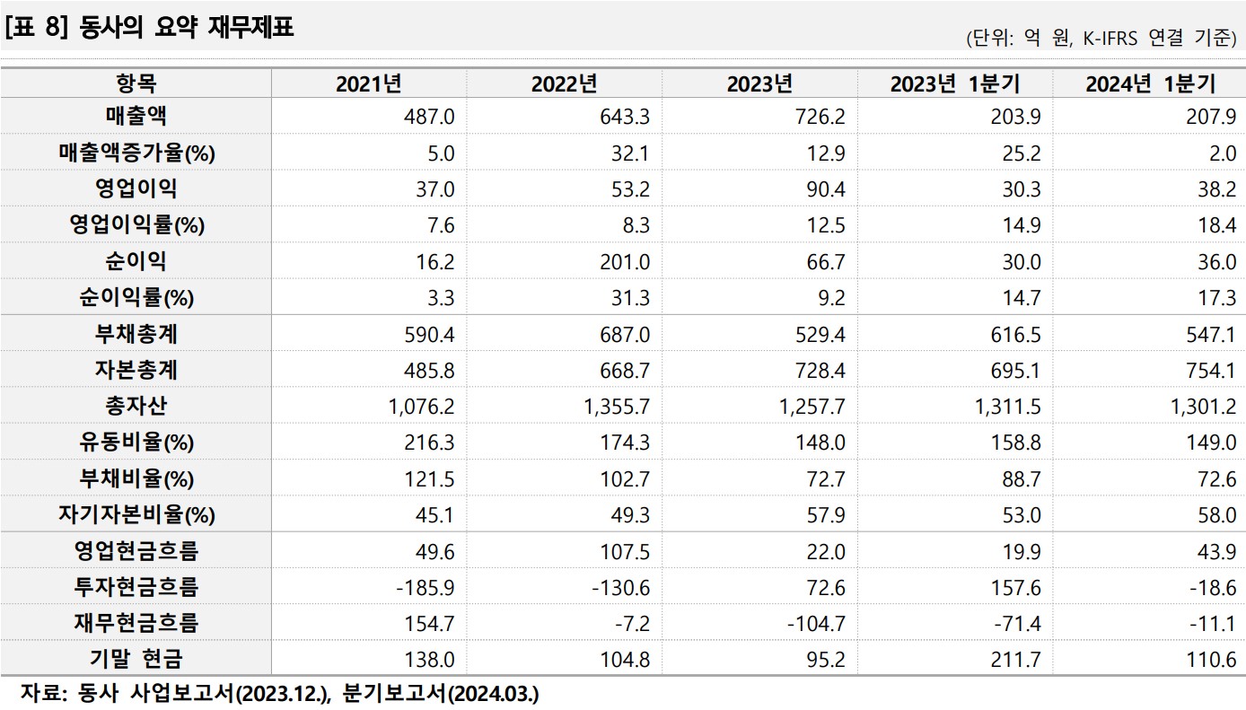 - 2023년 매출액 726.2억 원, 전년 대비 12.9% 증가