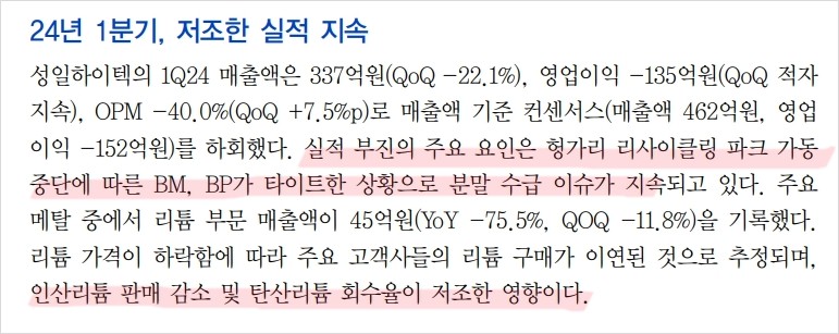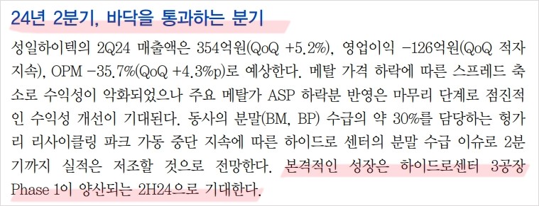 성일하이텍은 최근 헝가리 리사이클링 파크 가동 중단으로 인한 분말 수급 이슈로 어려움을 겪고 있음. 2024년 1분기 매출액은 337억 원으로 전년 동기 대비 22.1% 감소하고, 영업이익은 -135억 원으로 적자가 지속되고 있음. 그러나 하반기에는 하이드로센터 3공장의 양산이 본격화되면서 실적 개선이 기대됨.