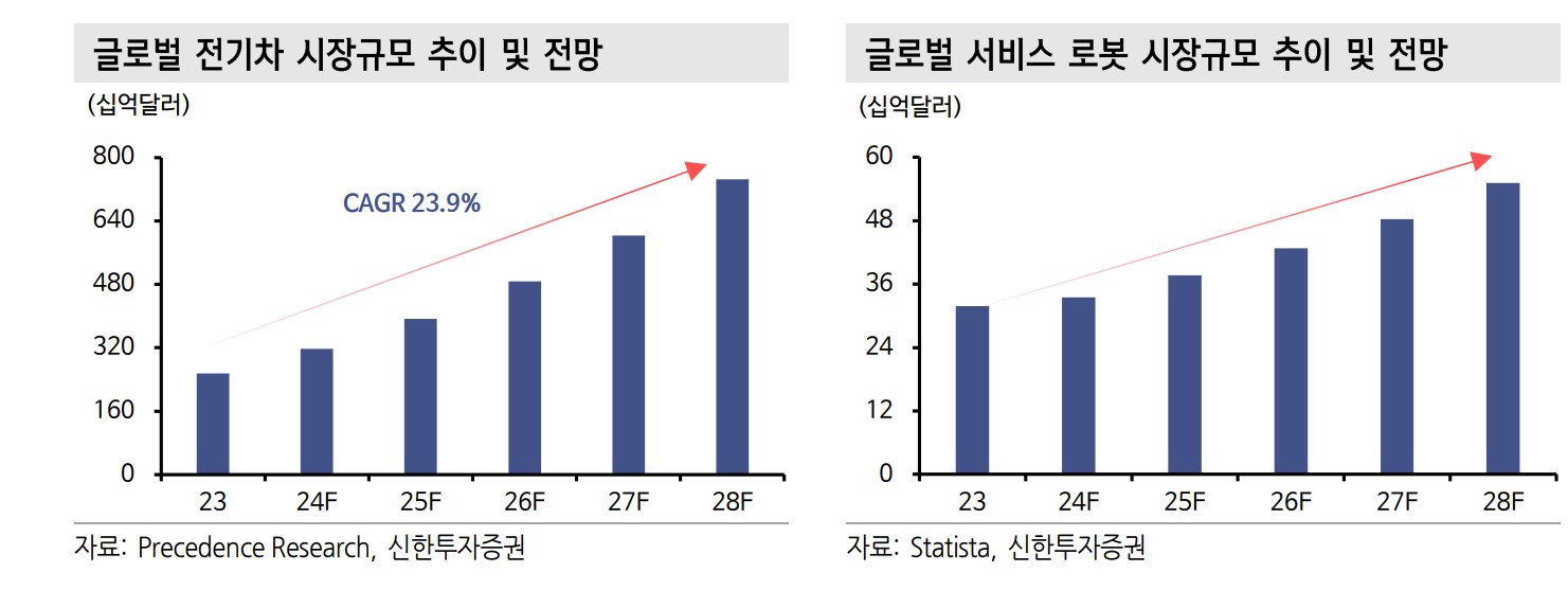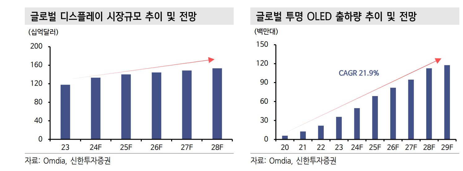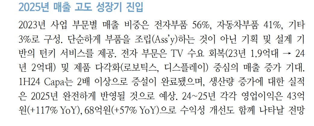 세아메카닉스는 최근 전자 부문에서 TV 수요 회복과 제품 다각화로 매출 증가가 기대됨. 1H24 Capa 증설이 완료되어 2025년부터 생산량 증가에 따른 실적 반영이 본격화될 것으로 보임. 전기차 판매량 성장률은 다소 부진하지만, 자동차 부품 출하는 꾸준히 증가하고 있음. 수주잔고는 5,500억원에 달하며, 일부 수주를 소화하는 단계에 있음. 팝업 디스플레이, 투명 OLED, 웨어러블 로봇 등 신제품 라인업 확대가 매출 성장에 기여할 것으로 예상됨.