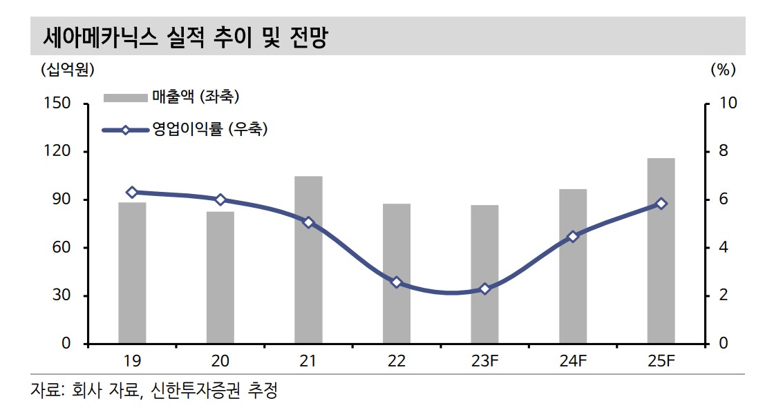 세아메카닉스는 전자 및 자동차 부품 제조업체로, 최근 실적 회복세를 보이며 투자자들에게 주목받고 있음. 로봇주가 아니여 ㅋㅋㅋ. 2024년 매출액은 968억원, 영업이익은 43억원으로 예상되며, 이는 전년 대비 각각 11.6%, 117.2% 증가할 것으로 전망됨. 본 글은 투자 권유글이 아님. 모든 투자책임은 본인에게 있음.