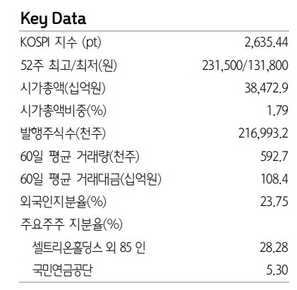 셀트리온은 바이오의약품 시장에서 강력한 경쟁력을 보유하고 있으며, 신약 개발과 매출 증대를 통해 지속적인 성장이 기대됨. 매출과 영업이익의 꾸준한 성장을 통해 미래 주가 전망이 긍정적임. 전구체 생산 능력의 확장과 글로벌 시장에서의 경쟁력을 기반으로 지속적인 성장이 기대됨.