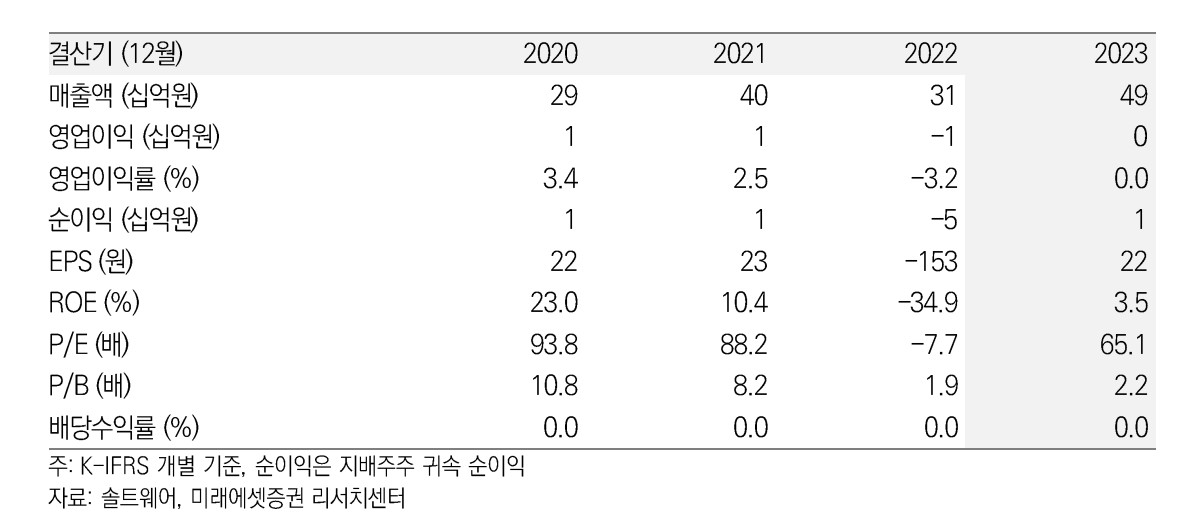 솔트웨어의 재무상황은 안정적임. 매출액과 영업이익이 지속적으로 상승하고 있으며, 부채비율은 낮은 수준을 유지하고 있음. 특히, 최근 몇 년간의 매출 증가율과 영업이익 증가율은 경쟁사 대비 높은 편임. 아래 표는 최근 4년간의 재무 데이터를 보여줌.