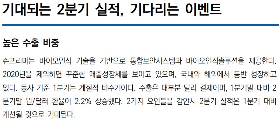 슈프리마는 바이오인식 기술을 기반으로 한 통합보안시스템과 바이오인식솔루션을 제공하는 기업임. 2020년을 제외하면 꾸준한 매출성장세를 보이며 국내외에서 동반 성장하고 있음. 2분기 실적은 1분기 대비 개선될 것으로 기대됨. 수출의 대부분이 달러로 결제되며, 원/달러 환율 상승 효과가 반영될 전망임. 또한, 안면 인식 제품의 높은 ASP가 실적 개선에 기여할 것으로 보임.