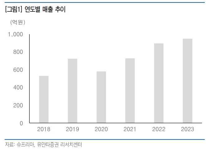 A. 슈프리마의 2024년 매출액은 1,000억원으로 예상되며, 이는 전년 대비 6% 증가한 수치입니다. 영업이익은 250억원으로 예상됩니다.