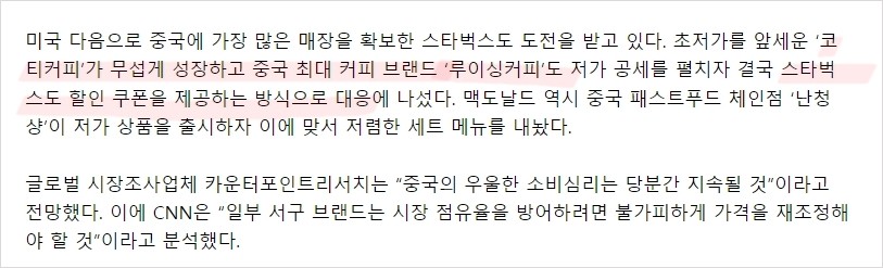 중국에는 짭벅스인 루이싱커피와 코티커피가 있는데 한국으로 따지자면 백다방이나 메가커피 같은 애들임. 원래대로라면 한국처럼 스타벅스 vs 저가브랜드가 차별화 되면서 매출에 영향이 없어야 하는데, 지금 중국 경제가 개판이 나버린 바람에 사람들 주머니에 돈이 없음.