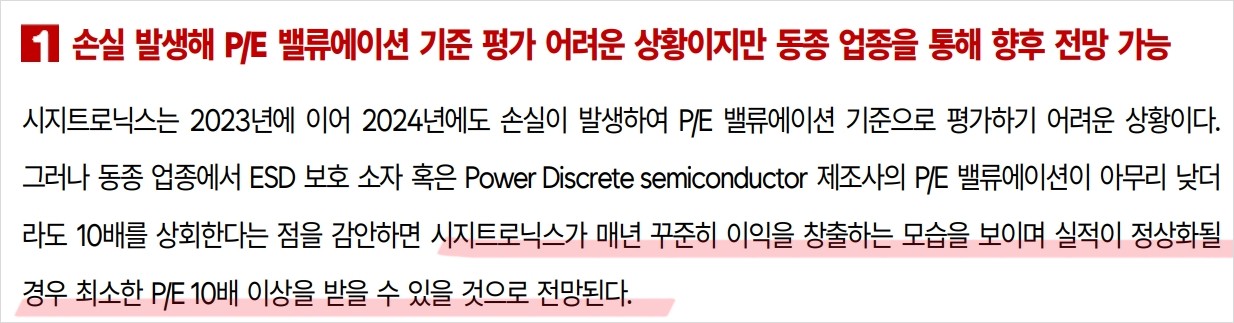 시지트로닉스는 ESD 보호 소자, Sensor 소자, Power 소자 등의 다양한 제품군을 보유하고 있으며, 기술력과 시장성을 동시에 갖춘 기업임. 특히 GaN 소재 전력반도체 개발을 통해 5G 통신 인프라와 자율주행차량 시장에서 중요한 역할을 담당하고 있음. ESD 보호 소자는 전자기기의 필수 부품으로서 수요가 꾸준히 증가하고 있으며, Sensor 소자는 자동차, 의료기기, 로봇 등 다양한 산업에 적용되고 있음. 회사의 재무 상황은 다소 부진했으나, 2024년 매출 증가와 영업손실 축소가 기대됨. 특히 GaN 소재 전력반도체의 성공적인 개발과 상용화는 회사의 장기적인 성장 가능성을 높일 것으로 보임.