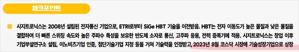 시지트로닉스는 기존 실리콘반도체가 아님 갈륨실리콘반도체 기술을 가지고 매출을 내는 기업인데 기술력이 좋다 나쁘다를 떠나서 이게 최적화가 안되는 바람에 실적이 나오질 않음. 기술의 최적화 이후 상용화까지 제대로 이루어져야 대규모 매출이 생기고 실적이 쌓일텐데 ㅠㅠ 영업이익이 적자라서 주가도 개똥임 ㅠㅠ 흑흑. 본 글은 투자 권유글이 아닙니다. 증권사 리포트를 바탕으로 작성되었음.