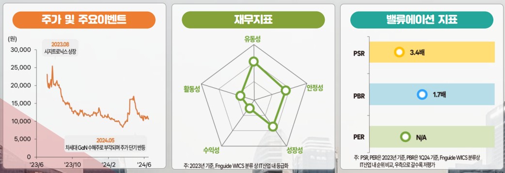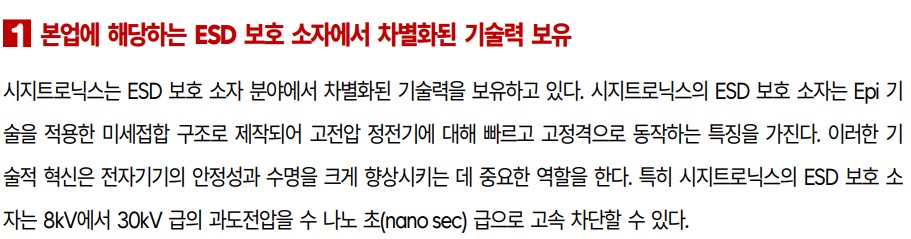 시지트로닉스는 ESD 보호 소자, Sensor 소자, Power 소자 등의 다양한 제품군을 보유하고 있으며, 기술력과 시장성을 동시에 갖춘 기업임. 특히 GaN 소재 전력반도체 개발을 통해 5G 통신 인프라와 자율주행차량 시장에서 중요한 역할을 담당하고 있음. ESD 보호 소자는 전자기기의 필수 부품으로서 수요가 꾸준히 증가하고 있으며, Sensor 소자는 자동차, 의료기기, 로봇 등 다양한 산업에 적용되고 있음. 회사의 재무 상황은 다소 부진했으나, 2024년 매출 증가와 영업손실 축소가 기대됨. 특히 GaN 소재 전력반도체의 성공적인 개발과 상용화는 회사의 장기적인 성장 가능성을 높일 것으로 보임.
