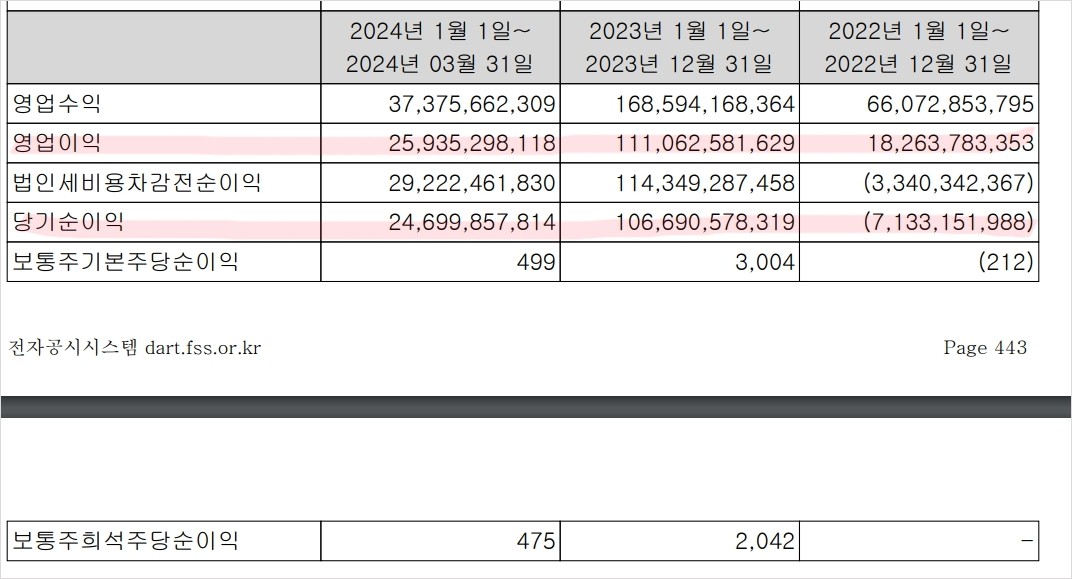 특히 영업이익이 2022년부터 흑자가 나기 시작하여 2023년에는 거의 10배 가까이 증가했다는게 고무적임. 이대로라면 2024년도 2023년 수준의 영업이익 흑자를 기록할 것으로 보임. 다음 신작 게임이 얼마나 히트를 치느냐가 관건이겠음.