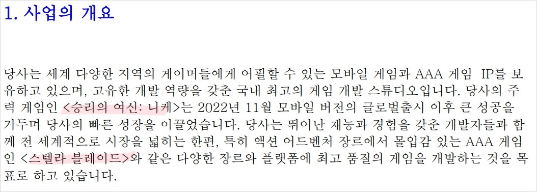 시프트업은 게임 개발 및 배급을 전문으로 하는 회사로, 대표적인 게임으로는 '데스티니 차일드'와 '니케' 등이 있음. 시프트업은 독창적인 게임 디자인과 강력한 스토리텔링으로 유명함. 시프트업은 글로벌 시장을 타겟으로 한 다양한 게임 프로젝트를 진행 중이며, 향후 새로운 장르의 게임 출시를 계획하고 있음. 회사는 또한, AI 기술을 활용한 게임 개발에도 주력하고 있음. 이러한 전략은 회사의 성장 가능성을 높이는 중요한 요소임.